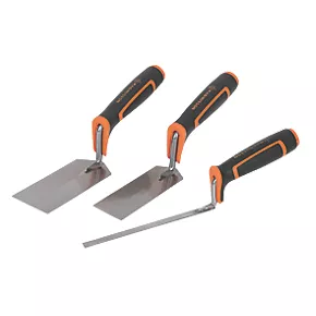 Heat-treated carbon steel blades with a soft-grip handle and finger guard protection. Set includes ½, 1½ and 2″ edging trowels.