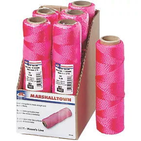 Twisted nylon construction which produces a sturdy and durable line. Once the line is created it is wound onto the cardboard core. Line is then ‘heat-set’ to stabilize and further strengthen it. Not affected by mortar, oil or mildew. Will not absorb water, therefore reducing the likeliness of the line breaking. The fluorescent pink colouring provides high visibility, meaning the line can be used in a number of conditions. Perfect for staking out sites, concrete and landscape layout, as well as brick and block laying.